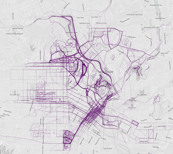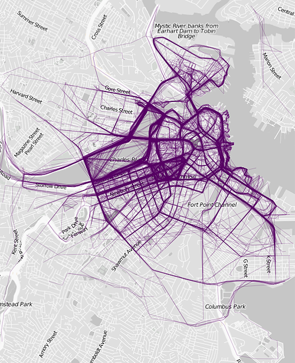 Ces parcours tissent de véritables toiles quadrillant les cités et mettent en avant les flux migratoires des joggeurs et les zones d’attractivité de cette pratique.
